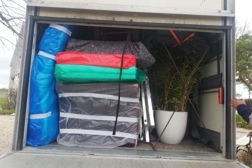Déménagement de mobilier protégé avec des couvrantes et du papier à bulles, des matelas et sommiers dans les housses adéquates, et des plantes. Une télévision enveloppée avec des couvertures. (…)
